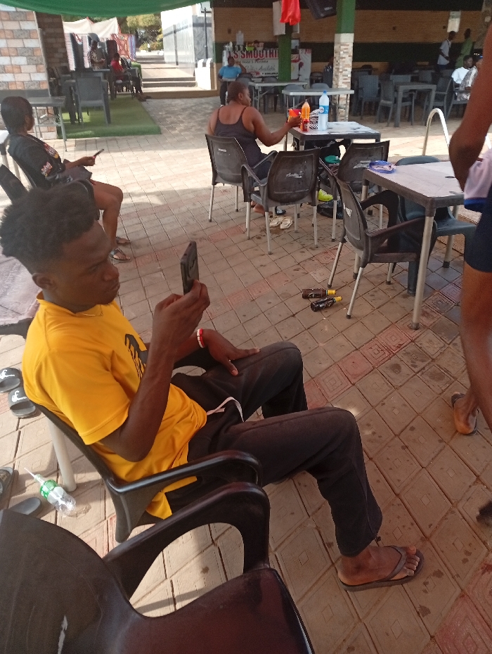 The scene depicts an outdoor or semi-outdoor seating area of a commercial establishment, likely a cafe or bar, in Onitsha, Nigeria. The ground is paved with reddish-brown interlocking tiles. Numerous dark plastic chairs and rectangular tables are arranged throughout the area, with some white chairs also visible. A green fabric canopy provides partial overhead covering. In the background, a building structure features a "SMOOTHIE" sign and a counter area. A tiled edge, possibly of a swimming pool, is partially visible in the deeper background. In the immediate foreground, to the left, a male with dark complexion, wearing a yellow t-shirt, black trousers, and dark flip-flops, is seated on a black plastic chair. He holds a black smartphone vertically with both hands, looking at its screen. A clear plastic water bottle lies on the tiles near his left foot. In the middle ground, to the right, an adult female with dark complexion, wearing a dark sleeveless top, is seated on a black plastic chair at a black table. She holds an orange-colored beverage in a clear glass or cup in her right hand. A clear plastic water bottle and another bottle are on her table. A pair of white flip-flops rests on the ground near her feet. To the left-midground, another person, appearing male, is seated on a dark plastic chair, facing away from the camera, also engaged with a smartphone. The lower legs and feet of a person, wearing dark shorts and light-colored flip-flops, are partially visible in the right foreground, indicating someone standing. On the ground between the tables in the mid-ground, two empty glass bottles, one brown and one green, are lying horizontally. Several other individuals are visible in the deeper background, seated at tables or standing near the "SMOOTHIE" counter.