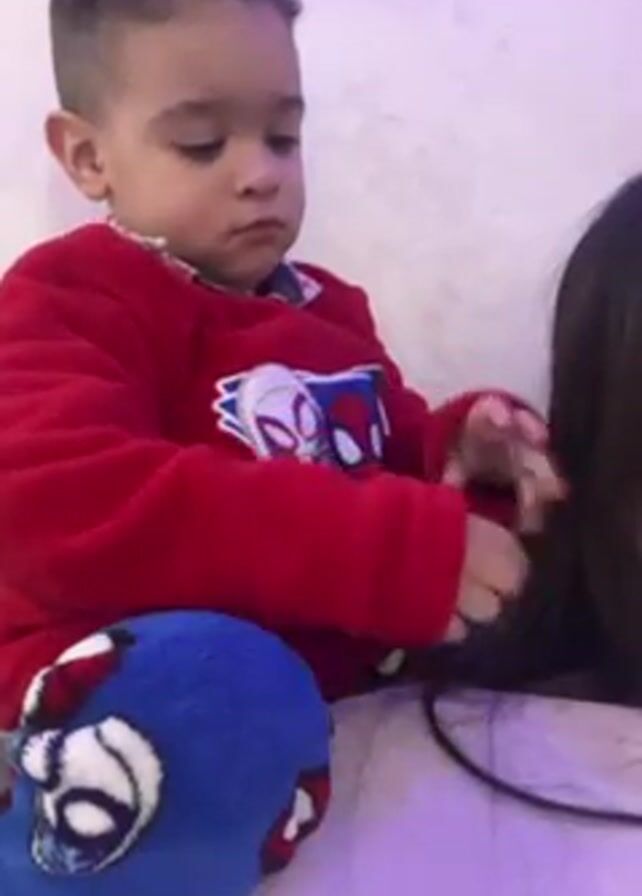 A toddler sits on top of an adult woman’s shoulders. The toddler has short, curly hair and is wearing a red, long-sleeved pajama top with a Spiderman design and blue Spiderman pajama pants. The woman has long, dark hair. The toddler grabs the woman’s hair and shakes it back and forth while making sounds. They are in an indoor space with a white wall in the background. The bed is covered with a white blanket.