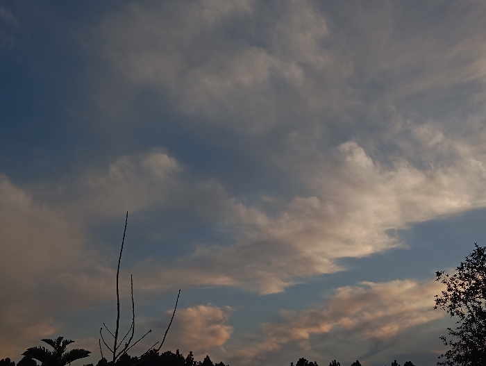This image displays an outdoor sky scene over Lassan, Pakistan, characterized by a dynamic cloudscape and a silhouetted natural foreground. The majority of the frame is occupied by the sky, which transitions from a deep blue at the top to lighter grey tones below. Scattered across the sky are numerous clouds of varying density and form; some appear white or light grey, while others, particularly in the lower-central and right portions, exhibit distinct yellowish-orange and pinkish hues, indicative of low-angle sunlight (either dawn or dusk). The bottom edge of the image features a dark, indistinct horizon line composed of silhouetted vegetation. Prominently, several thin, bare tree branches extend vertically from this silhouette in the central-left area. Dense masses of dark foliage are visible on the far left and along the right edge of the frame. No individuals, animals, or artificial structures are discernible.