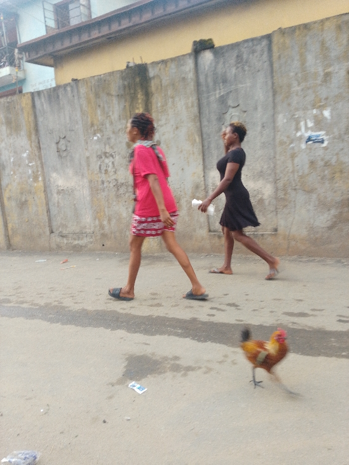 Two women stroll along a sidewalk beside a weathered concrete wall. The woman closer to the camera wears a pink t-shirt and patterned skirt, while the other wears a black dress. Both wear casual footwear. A chicken strides in the foreground, its motion blurred, suggesting swift movement. Litter dots the pavement. A building with visible windows stands in the background above the concrete wall.