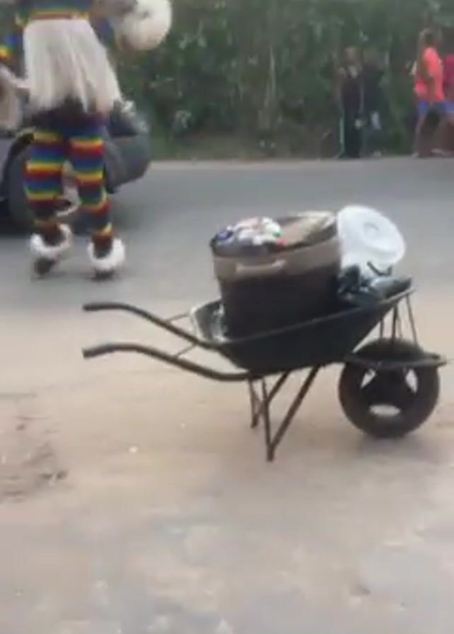 person in a colorful costume, perhaps a masquerade or traditional dancer, performing on a street. The costume includes a white, shaggy headpiece, striped legs, and platform shoes. A wheelbarrow filled with various items, including a large pot, a grill, and a white bucket, sits on the side of the road in the foreground. Several other people are present, some watching the performance and others walking by. A dark SUV is parked nearby. The setting appears to be a village or rural area, with trees visible in the background. The overall atmosphere seems festive.