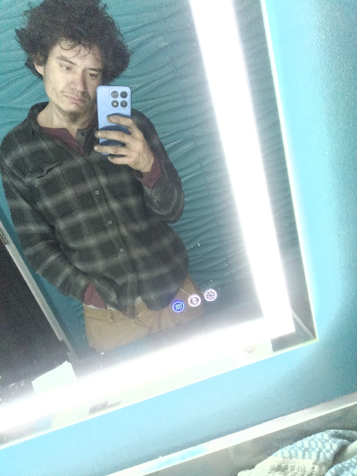 A man with dark curly hair takes a selfie in a bathroom mirror. He's wearing a plaid shirt over a maroon top and khaki pants. The mirror is illuminated with a bright LED light strip. The background features textured teal walls. The camera is a light blue smartphone with multiple lenses. Several control buttons are visible on the mirror's surface.
