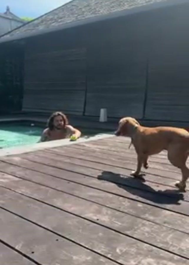 A shirtless man with long hair and a beard is standing in a pool while holding a small, green object. A golden-brown dog with a green collar is standing on a wooden deck and facing the man. The deck is next to the pool and in front of a large, gray, wooden building. The sky is blue and sunny.