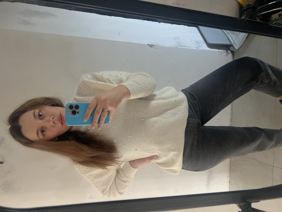 The scene depicts a female individual taking a mirror selfie indoors, described as being in the city of Leninakan, Russia. The subject is a woman with long, light brown hair, appearing to have a light complexion and wearing light makeup, including lipstick. She is dressed in a long-sleeved, cream-colored, high-neck sweater adorned with numerous small, light-colored pearls scattered across the fabric, particularly dense on the shoulders and upper chest. She also wears dark gray or black jeans. Her left hand is placed on her hip, while her right hand holds a light blue smartphone, visible in the reflection, positioned to capture the image. A metallic ring is present on the ring finger of her left hand. The reflection shows a light-colored wall with some visible imperfections, possibly areas of wear or unfinished plaster. The mirror itself has a thick, dark frame, partially visible on the left and right sides of the image. The floor in the reflection appears to be composed of light-colored, possibly white or cream, tiles. In the lower right corner of the reflected background, some indistinct objects, including what appears to be a gray item, are partially visible.