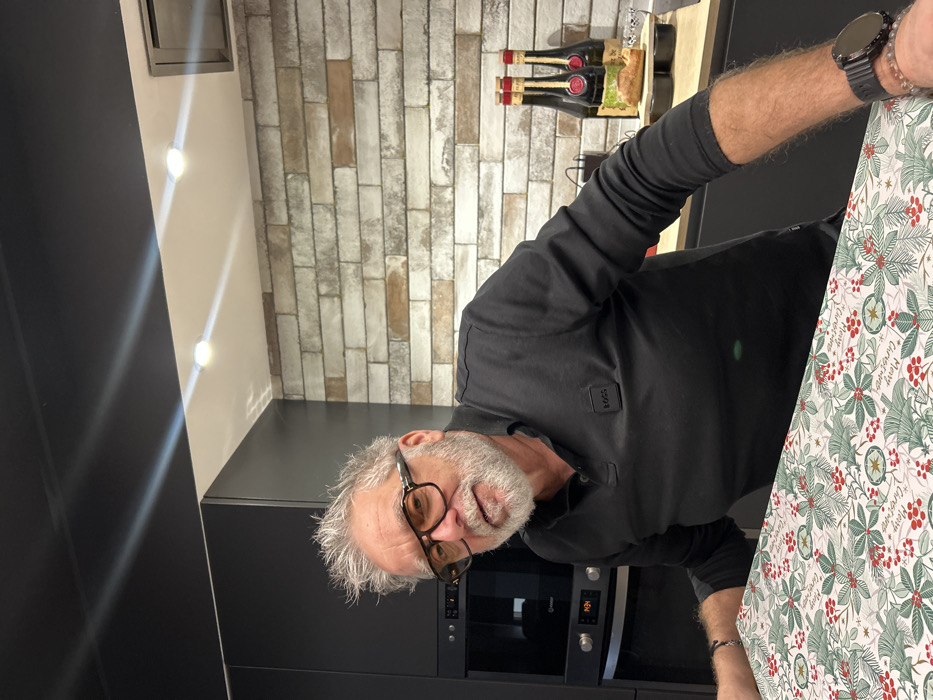 The image depicts a domestic kitchen interior in Saint-Médard-en-Forez, France. A Caucasian male, appearing middle-aged with gray, disheveled hair and a gray beard, is seated at a table covered with a white tablecloth featuring a red and green holly, berry, and "Merry Christmas" pattern. He is wearing dark-framed eyeglasses and a long-sleeved black polo shirt with a "BOSS" logo on the left chest. His arms are visible, resting on the table or leaning forward. A black wristwatch is present on his left wrist. The background reveals a modern kitchen. To the left of the male, built-in black cabinetry houses a black oven with visible controls and a digital display showing "14:34." Above the oven, another black appliance, possibly a microwave or additional oven, is integrated. The wall behind the male features a light-colored, multi-toned brick or tile backsplash. Above the backsplash, the ceiling is white with two recessed circular spotlights emitting visible light beams. To the right, on a dark countertop against the brick wall, three dark green or black bottles with red caps and gold foil details, possibly wine or champagne, are standing. Adjacent to these bottles, a light-colored pastry or bread item rests in a black, multi-compartment baking tray or serving dish. Overhead, dark cabinetry extends across the top of the scene.