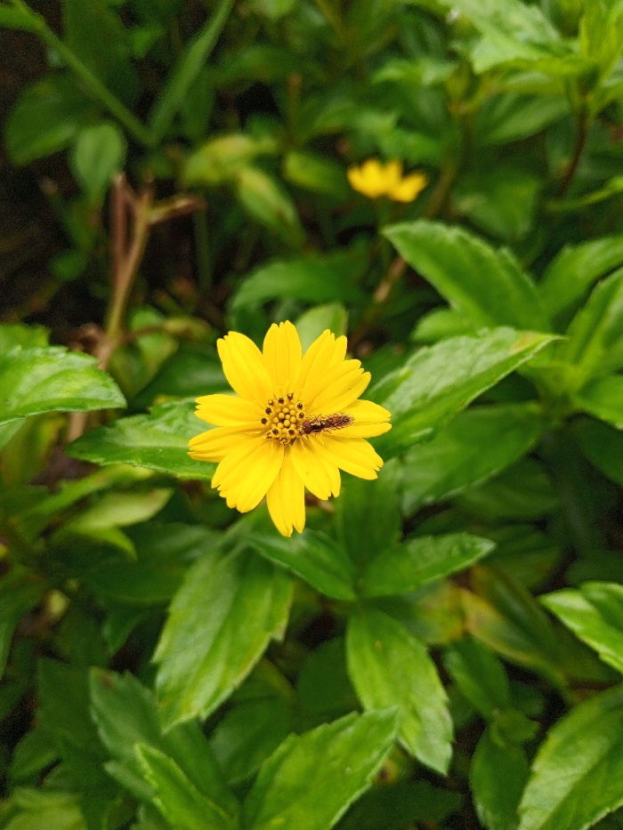 A vibrant yellow flower, akin to a small sunflower, dominates the frame amidst a backdrop of lush green leaves. An elongated, brown insect rests upon the flower's center. The leaves are broad and glossy, suggesting a well-watered environment. A second, smaller yellow flower is visible in the blurry background. The overall composition evokes a sense of natural beauty and vibrant life.