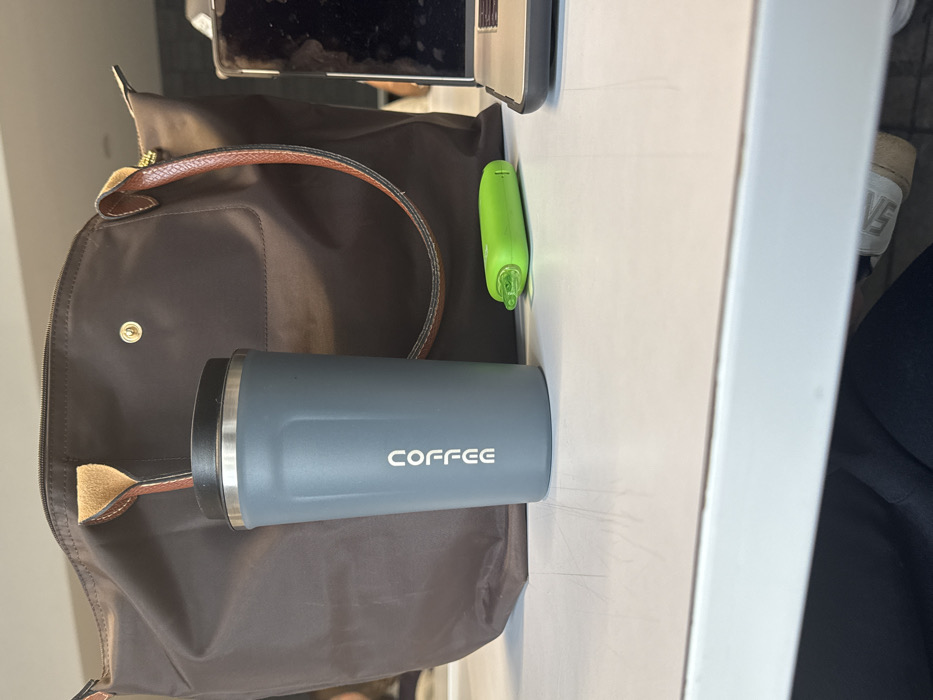 The image displays an indoor scene on a light-colored table in Mexico City, Mexico. In the immediate foreground, below the table, a person's legs are visible, wearing dark pants and white and tan sneakers. On the tabletop, a gray insulated travel tumbler with the word "COFFEE" printed vertically in white text stands prominently. To its right, a bright green, cylindrical object, consistent with a disposable vape pen, lies horizontally. Further to the right, the left portion of an open laptop with a dark screen is visible. Behind these items, a dark brown tote bag with brown leather handles and a gold-colored snap closure rests on the table. All subjects are stationary.