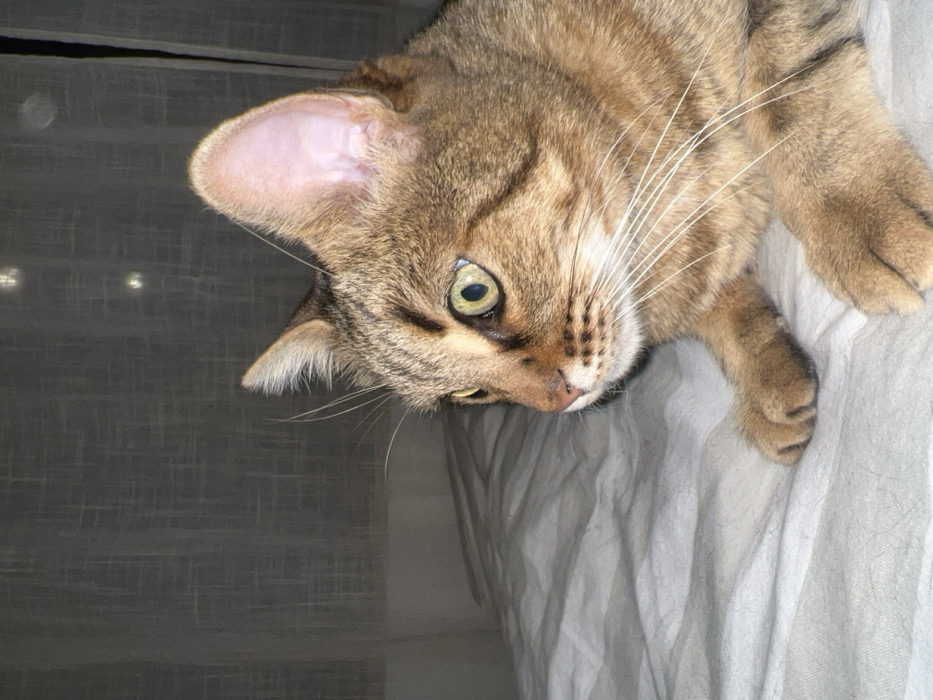 - "An indoor scene depicts a short-haired tabby cat, predominantly brown with darker stripes, lying on a light-colored, possibly white or grey, wrinkled sheet or blanket" by FM-XA2Is1, licensed under CC BY 4.0