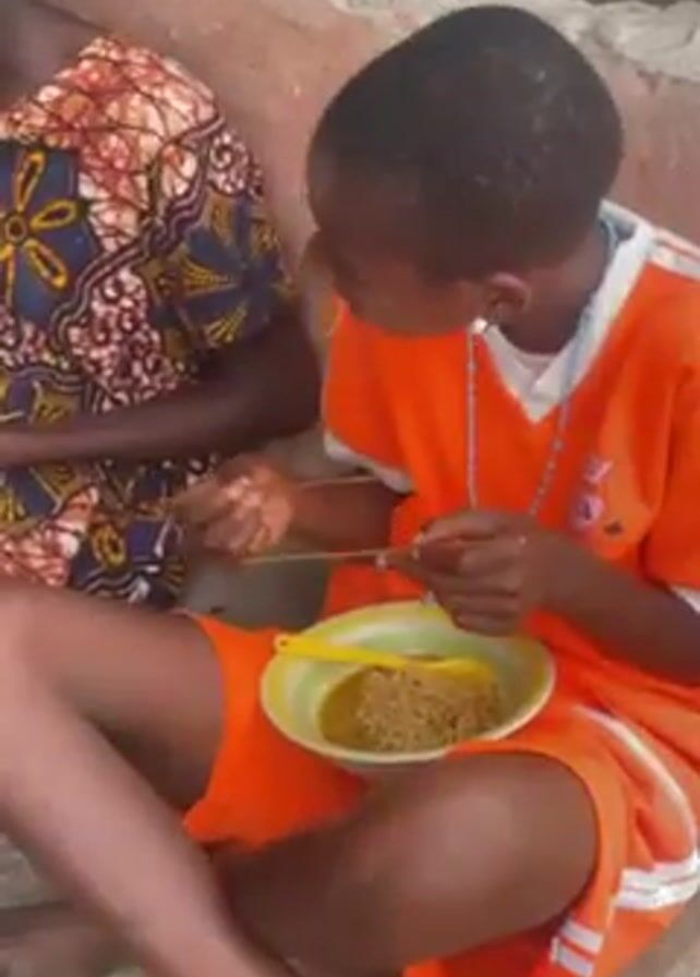 Two young people are sitting on a concrete ledge outside of a small building. One is wearing a colorful patterned dress and eating from a clear plastic container. The other is wearing an orange t-shirt and shorts and eating noodles from a yellow bowl with a spoon and what appears to be wooden chopsticks. They seem to be conversing and enjoying their meals. Behind them, the building is adorned with various items, including boxes, frames, and hanging goods, indicating a small shop or store. The surrounding environment appears to be an outdoor area with scattered debris and simple structures.