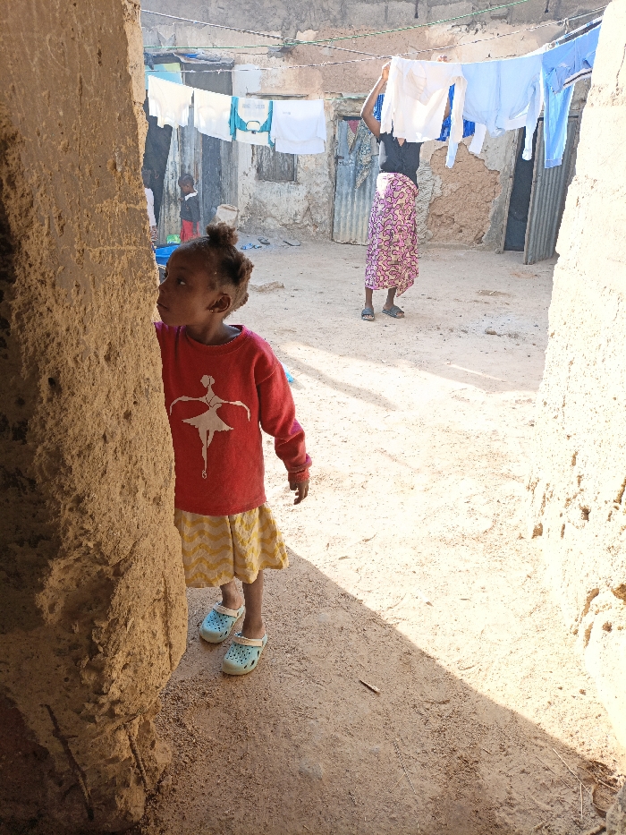 A young girl in a red sweater with a ballerina design, a yellow skirt, and blue clogs stands beside a rough wall. Behind her, a woman hangs laundry on a clothesline. The laundry consists of various colored shirts. Another child is visible in the background. The scene is bathed in sunlight, casting shadows on the ground. The setting appears to be a rural or impoverished area, with weathered buildings and unpaved ground.
