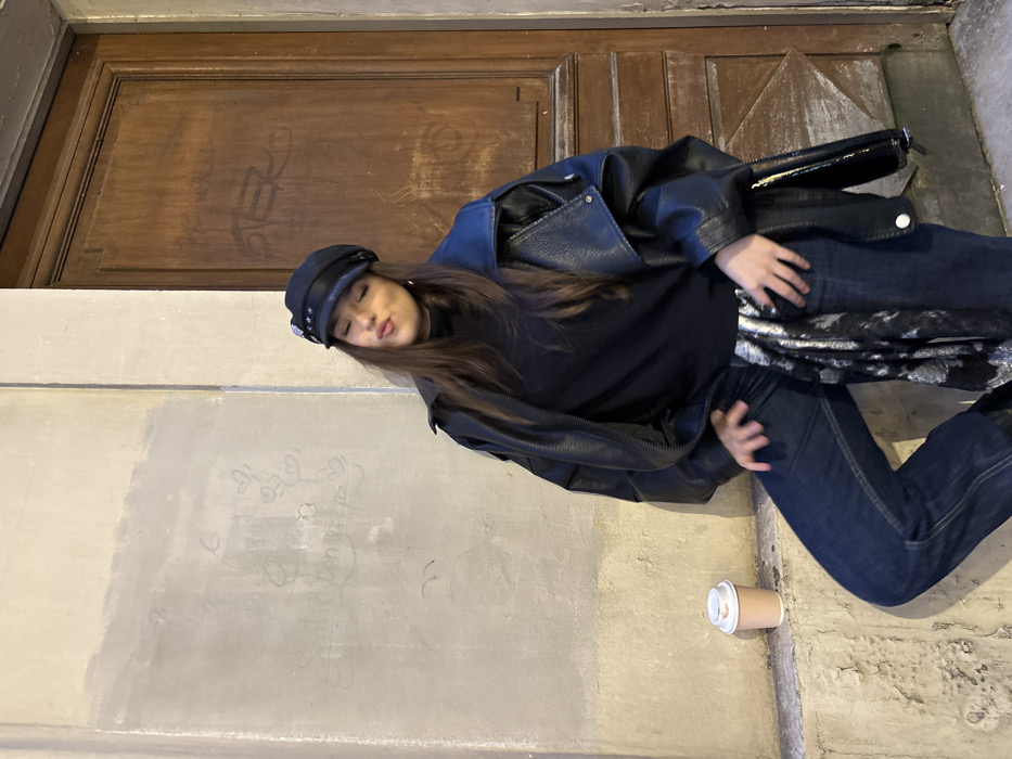 A young woman in a black cap, jacket, and jeans poses against a textured wall and a wooden door backdrop. Her lips are pursed as she looks down. A discarded coffee cup sits on the ground near her. The woman's outfit includes a black shirt underneath her leather jacket and a patterned scarf. The setting appears to be an urban street or alleyway.