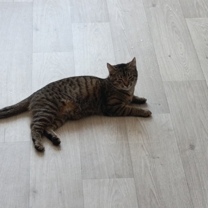 - "A domestic tabby cat is observed lying horizontally on a light grey, wood-patterned floor, likely laminate or vinyl, within a building located in Hlybokaye, Belarus" by FM-fpfCx2, licensed under CC BY 4.0