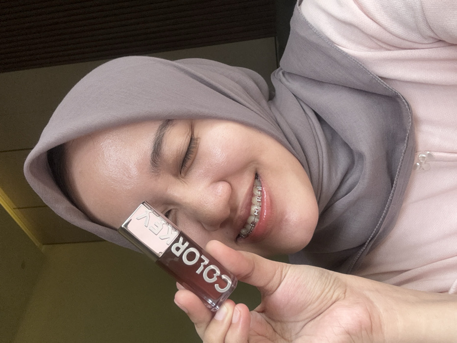 A woman in a gray hijab and pink shirt is smiling with her eyes closed. She has braces. She is holding a clear tube of "COLORKEY" brand lip gloss with a brown-red tint and a silver lid in her right hand. The label is rotated towards the viewer. The background is out of focus, suggesting an indoor setting.