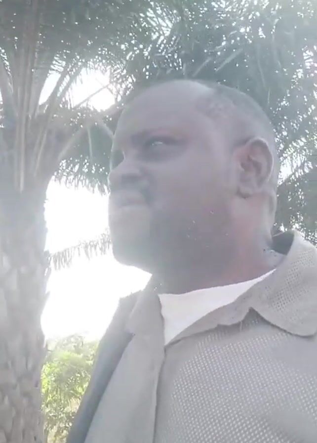 man with dark skin and a beard speaking to the camera. He is wearing a grey collared shirt with a white t-shirt underneath and has a black strap over his shoulder. The background includes a palm tree and other greenery. The lighting is bright, and the sun is visible through the palm tree. The man’s eyes widen briefly as he speaks.
