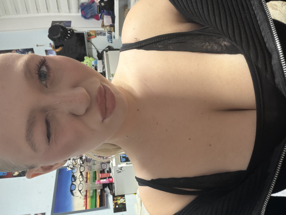 An individual is depicted in a close-up, waist-up portrait taken indoors, presumably in Yanino-1, Russia. The subject is a fair-skinned person, likely female, with blonde hair pulled back. Their left eye is open, displaying a blue iris with visible mascara on the eyelashes. The right eye is closed in a wink, creating wrinkles at the outer corner. The lips are pursed, covered in a matte nude-pink lipstick. Freckles or small moles are visible on the upper chest and shoulders. The subject is wearing a black bra, the straps of which are visible, underneath a black, ribbed, long-sleeved garment, possibly a top or jacket, which is unzipped to reveal cleavage. The background, partially visible, suggests a personal room. To the subject's left, a light blue wall features taped posters or images. Below this, a multi-colored artwork or stand displays several pairs of eyeglasses. A white surface underneath holds cosmetic products in pink packaging and additional eyeglasses. To the subject's right, a white horizontal window blind is present. Below it, a dark, stylized object resembling an animal head with yellow accents rests on a surface, next to a lime green plush toy and a blue and red plush toy. White shelving units are visible further right.