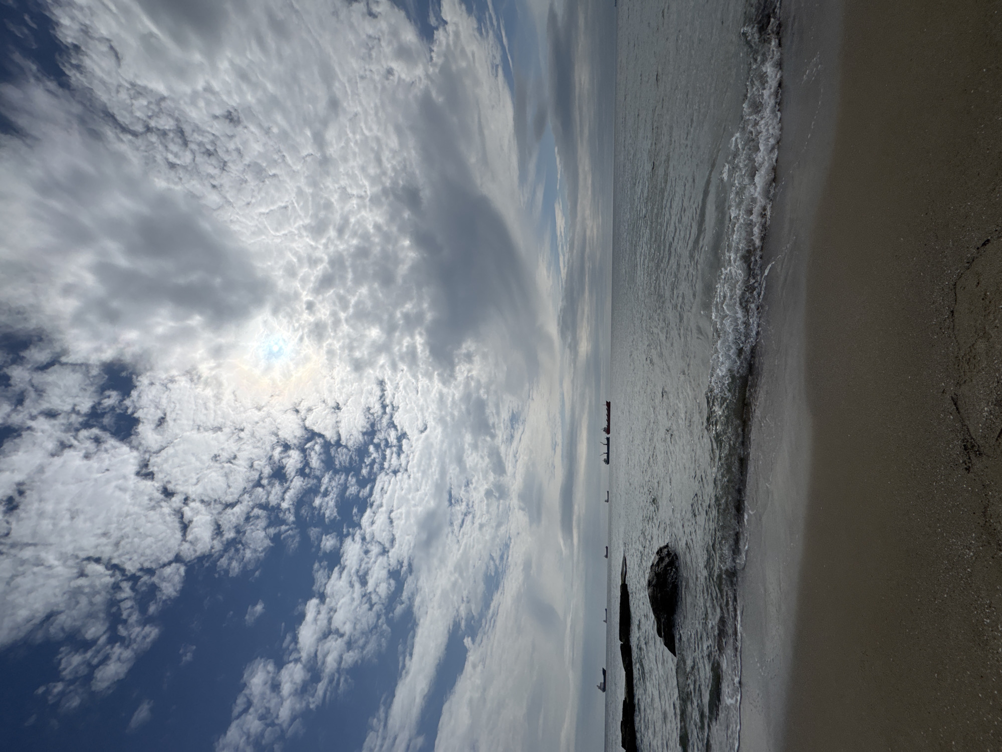 The image depicts a beach in Varna, Bulgaria. The right side of the image shows the shoreline with sand and gentle waves meeting the sea. Some rocks and dark debris are scattered along the beach near the water's edge. In the sea, distant objects resembling boats or ships are visible on the horizon, appearing as small silhouettes against the water. The left side of the image is dominated by a sky filled with clouds, ranging from dense, bright white formations to areas with darker, gray tones. The sun appears to be shining through the clouds, creating a bright spot in the sky.