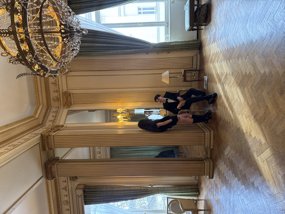 The image depicts an interior scene within a grand, high-ceilinged room in London, United Kingdom. The room features a herringbone pattern wooden floor and cream-colored walls adorned with extensive gold-colored neoclassical molding and fluted columns with ornate capitals. Several large wall mirrors are integrated between the columns. Two large windows, draped with heavy dark green curtains, allow natural light to illuminate the space and reveal an indistinct urban exterior with trees and buildings. A multi-tiered brass and crystal chandelier hangs prominently from the ceiling in the upper right quadrant. Two individuals are situated in the center-right of the frame. A female with long dark hair stands, facing left, leaning against one of the fluted columns. She wears a black short-sleeved top or dress, a black mini-skirt, black knee-high socks or boots, and black high-heeled shoes. Opposite her, a male with short dark hair is seated in a light-colored armchair, facing the female. He wears a black tuxedo with a white dress shirt and black bow tie, holding a light brown rectangular object in his lap. His legs are crossed at the ankles. A small wooden side table with a cream-shaded lamp and a clear glass is positioned to the right of the seated male. A folded newspaper or document lies on the floor near his feet. In the background, to the right, an upholstered stool or bench is visible, with a dark bag placed beneath it. To the far left, a light-colored upholstered armchair with wooden trim is situated near a window.