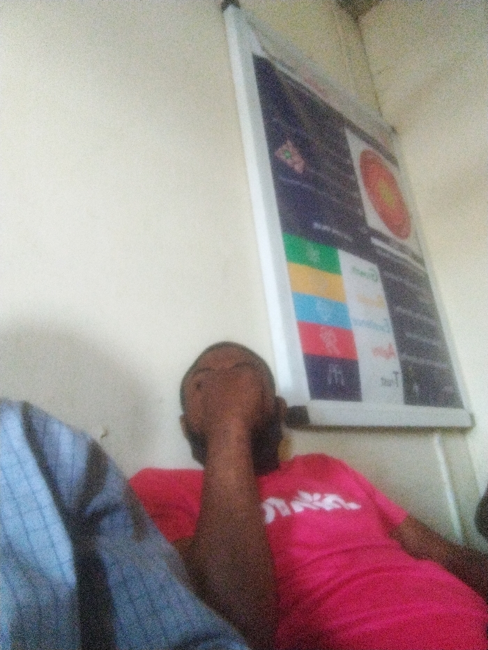 The image captures an indoor scene in Fagge A, Nigeria. A dark-skinned individual, wearing a pink t-shirt with indistinct white lettering on the chest, is visible in the lower right and central portions of the frame. Their left hand is raised, partially covering their face and resting near their chin. To the far left, a section of blue and white checkered fabric, resembling clothing, is present. In the background, mounted vertically on a light-colored wall, is a large display board with a white frame. The board features a prominent red circular graphic with a yellow center in its upper right section, and below this, several horizontal bands of color, including green, yellow, light blue, red, and dark blue, each containing blurry text or graphics. The overall image exhibits graininess and a soft focus.