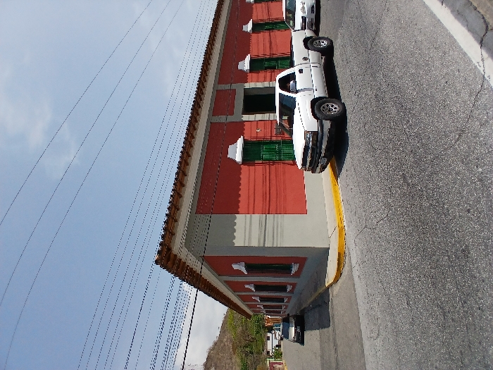 The image depicts a static street scene in San Joaquín, Venezuela, under a clear sky with scattered clouds. A one-story building with red walls, grey trim, and a terracotta tiled roof dominates the right and center of the frame. Its facade features green shuttered windows with white decorative sills and a central green entrance door. A white Chevrolet Silverado pickup truck is parked on the asphalt street, facing left, adjacent to the building's corner. The front end of another white vehicle is partially visible behind the pickup. Further down the street, around a corner to the left, a dark-colored sedan is parked. The asphalt road shows signs of cracking, and a yellow curb separates it from the sidewalk alongside the building. In the distant background to the left, a vegetated hillside is visible. Multiple black utility lines traverse the upper portion of the frame against the sky. No individuals are present in the scene.