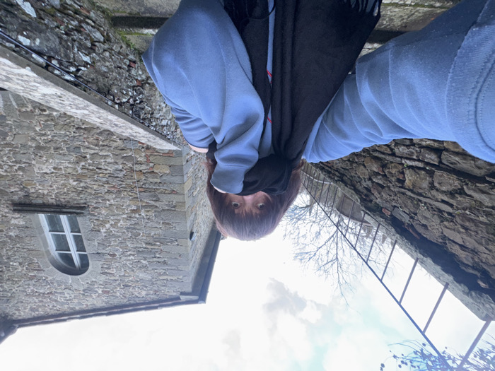 A selfie taken from a low angle shows a person with dark hair and a black scarf covering their face, wearing a light blue hoodie. The background consists of a stone building with a curved window and a stone wall. A metal ladder is attached to the wall. Bare tree branches are visible in the background. The sky is visible, with some clouds. The image is rotated, making the composition somewhat disorienting.