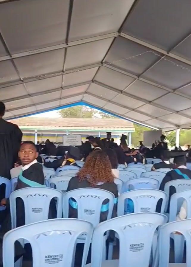 Under a large white tent structure with a light gray interior ceiling and white supports, a crowd of people dressed in black graduation gowns are seated in rows of light blue plastic chairs that are labeled with "Kenyatta University." The chairs are arranged closely together, and people are seen milling about and sitting down. The view is somewhat obscured by the backs of chairs and the heads and shoulders of seated individuals. The scene appears to be set outdoors. Through the open sides of the tent, there is a view of a building, trees, and a bright sky. The sound of a lively tune plays in the background.