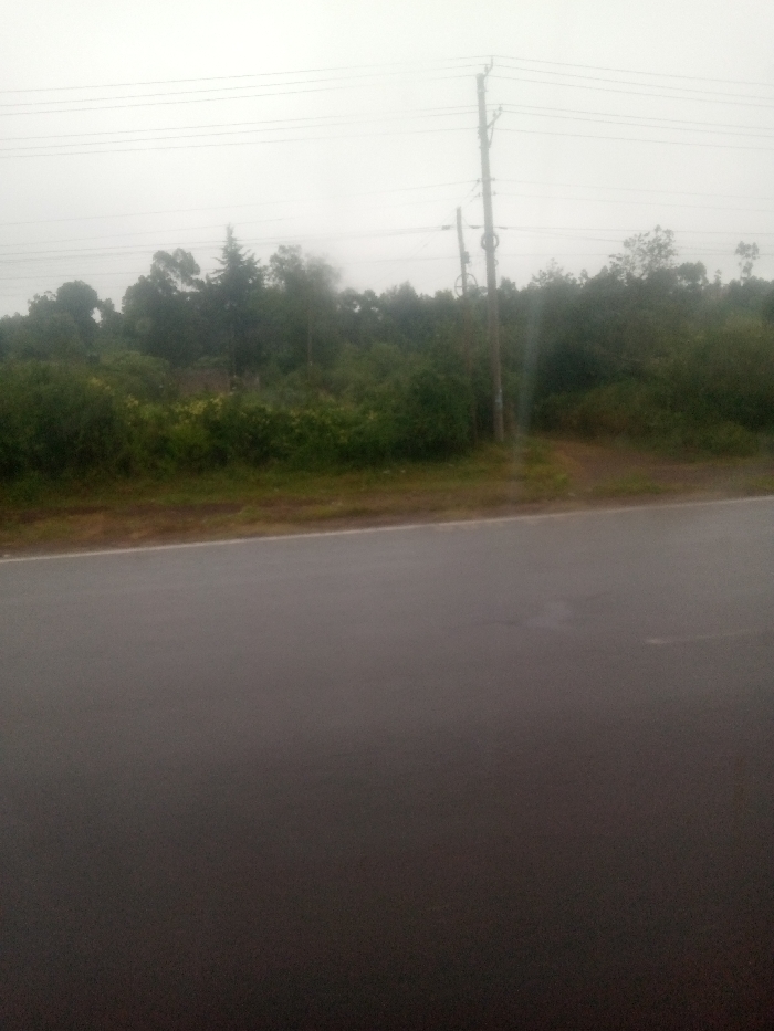 This image displays an outdoor scene in Sigona ward, Kenya, under an overcast sky. The lower half of the frame is occupied by a dark, wet paved road surface featuring a white edge line along its far side. Beyond the road, dense green foliage comprising trees and bushes forms the middle ground. Two wooden utility poles stand vertically on the right side of the image; the taller pole supports multiple overhead wires that extend horizontally across the upper portion of the frame. A narrow, unpaved path diverges from the road's edge and leads into the dense vegetation, located between the foliage and the utility poles. The sky is uniformly light grey, consistent with overcast or misty conditions. No individuals, vehicles, or animals are visible.