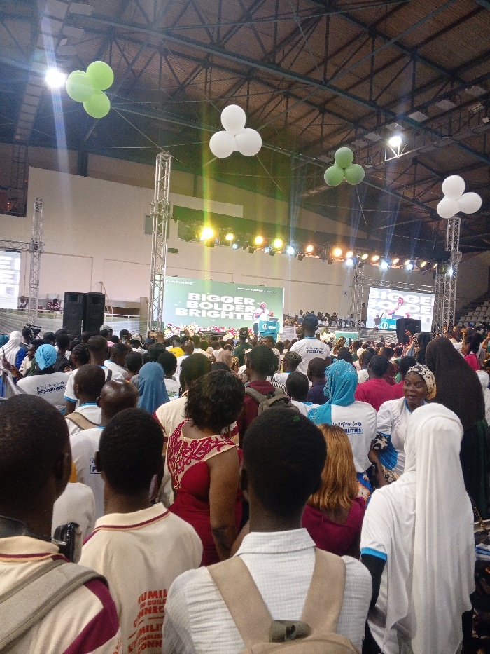 This image captures a densely populated indoor event within a large arena or hall in Kubwa, Nigeria