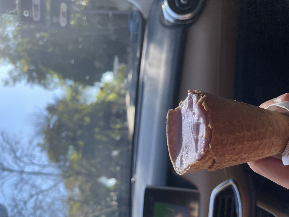 A partially eaten purple ice cream cone is held in front of a car's interior