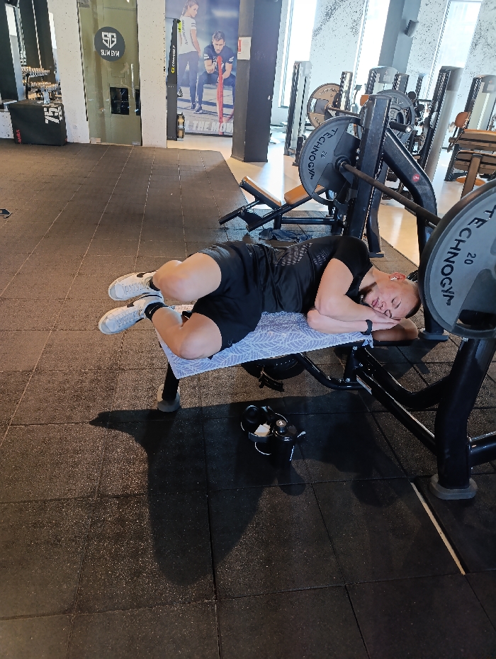 The scene depicts the interior of SLIM GYM in Silistra, Bulgaria. An adult male is positioned prone on his right side across a black gym bench, which is covered by a light-colored, patterned towel. He is dressed in a black patterned athletic shirt, black shorts, white socks, and white athletic shoes, with a dark-colored fitness tracker on his left wrist. His eyes are closed, and his left hand is near his head. On the dark gray rubber mat flooring beneath the bench, a black water bottle and a pair of black over-ear headphones are present. The background reveals additional gym equipment, including Technogym branded barbells with visible 20 KG weight plates, other weight benches, and a large wall mural depicting two fitness models. A glass door featuring the SLIM GYM logo is visible on the left side of the frame.