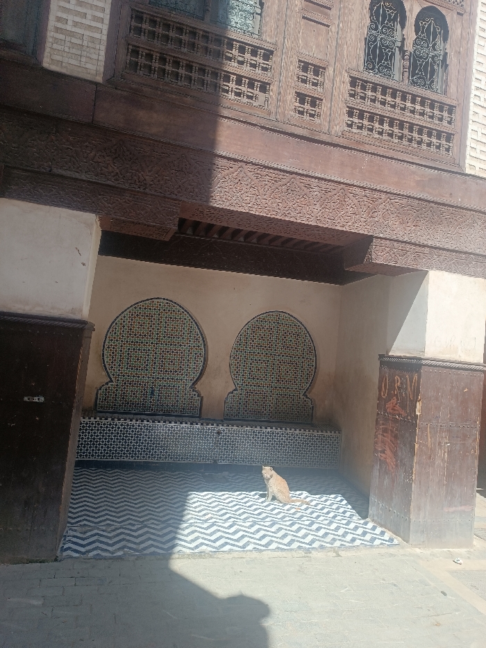 The image depicts an exterior architectural scene in the city of Meknes, Morocco, bathed in strong sunlight with distinct shadows. A single light-colored, short-haired cat is seated upright on a black and white chevron-patterned tiled floor, positioned in the lower-middle of the frame and facing slightly towards the right. The background wall features two identical, arch-shaped decorative panels or fountains, each meticulously covered in colorful, small geometric zellij mosaic tiles. Below these arches, a rectangular bench-like structure is also adorned with intricate dark geometric zellij tiling. Above this tiled section, a massive, horizontally spanning dark wooden beam is visible, heavily carved with detailed Islamic geometric and floral motifs. Above this beam, a dark wooden balustrade or screen, featuring gridded and arched window elements, is present. Segments of light-colored brickwork are visible at the upper left and right edges of the frame. The tiled wall area is flanked by two dark, paneled wooden columns or pilasters. The column on the right displays faint white graffiti, resembling "O.R.M.", and some reddish-brown scuff marks. The immediate foreground consists of plain grey paving stones, with a distinct, dark shadow cast across the lower left section of the frame. No other people or animals are present.