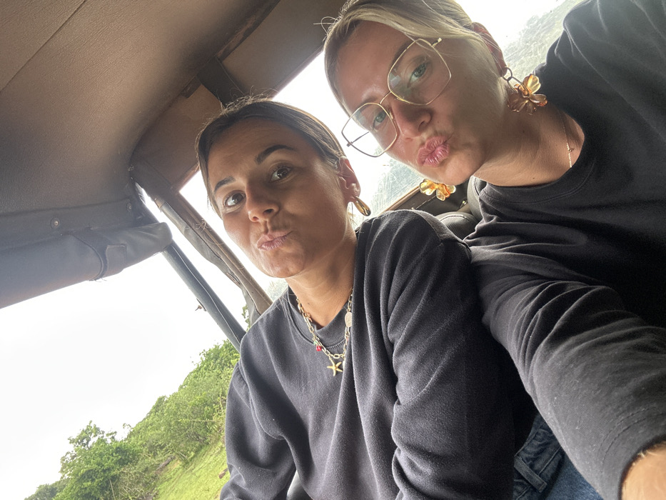 Two women pose inside a vehicle. The woman on the left has dark hair pulled back, a gold necklace, and hoop earrings, pursing her lips. The woman on the right wears gold-rimmed glasses and flower-shaped earrings, also with pursed lips. Both wear dark long-sleeved shirts. The car's interior is visible, and glimpses of green landscape can be seen through the windows.