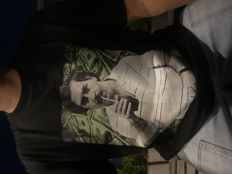 A person wears a black t-shirt featuring a print of Pablo Escobar, set against a background of US hundred-dollar bills
