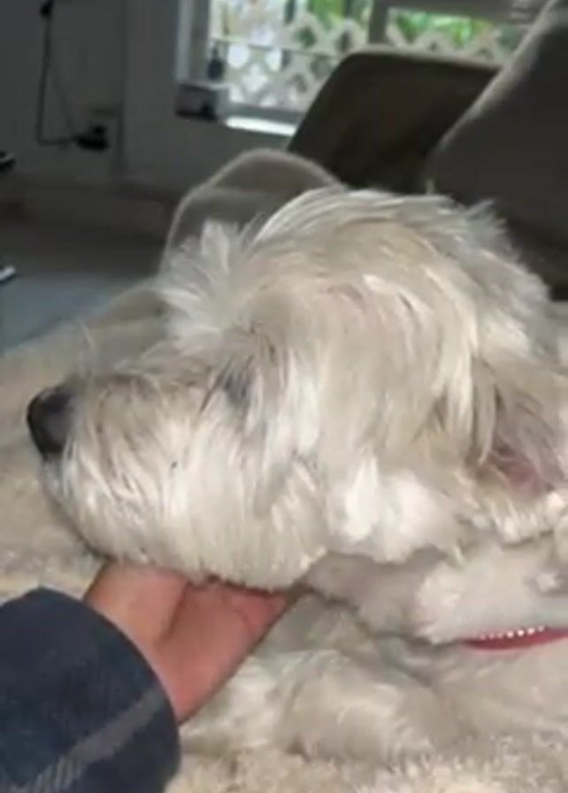 A hand pets a sleeping dog, lying on a blanket. The dog is white, fluffy, and wearing a red collar. The hand belongs to someone wearing a blue and black plaid flannel shirt. The hand is seen stroking the dog's head and neck gently. A ring is visible on the hand. The dog is lying on a blanket in what appears to be a living room, with a window showing an outdoor scene in the background.