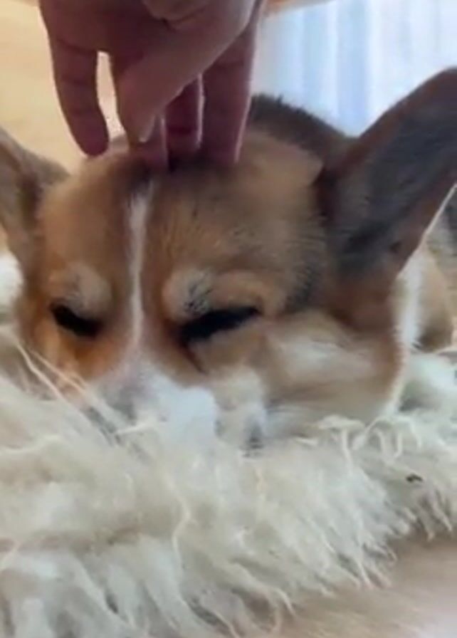 A hand is petting a corgi's head, which is lying on a fluffy white rug