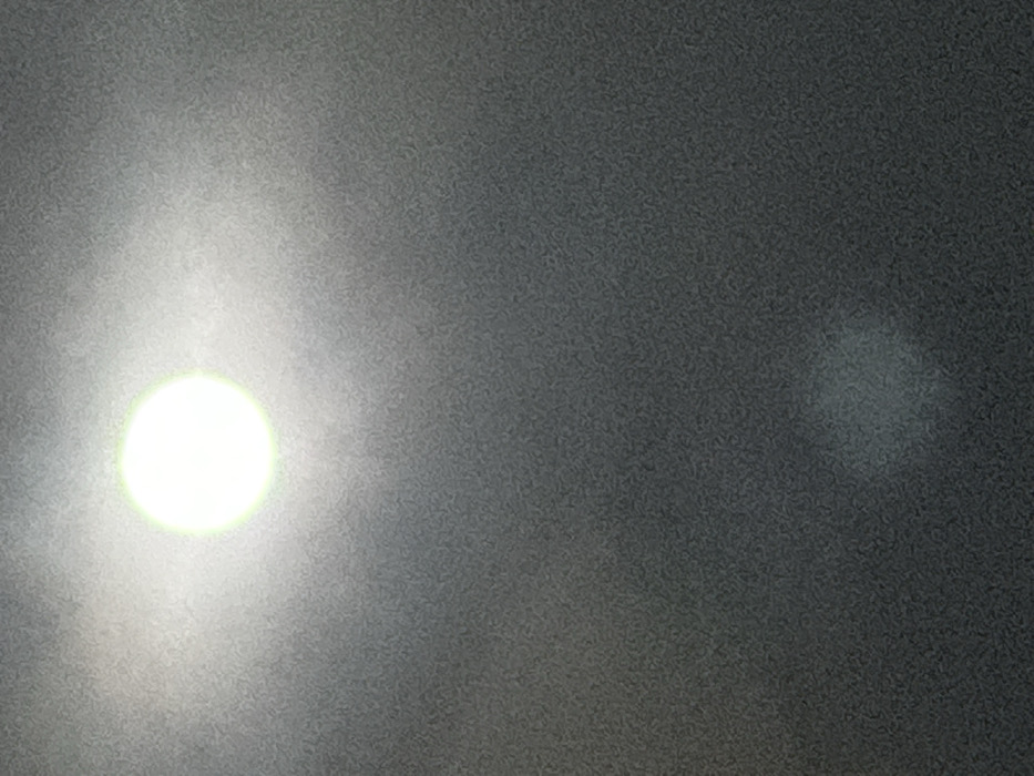 This image is situated in Vevey, Switzerland. The scene is dominated by an intensely bright, circular white light source with a distinct green perimeter, positioned centrally in the upper third of the frame. This light illuminates the immediate surrounding area with a soft, diffuse glow against an otherwise dark, uniformly textured, and heavily granular background. A secondary, significantly fainter, and more diffuse light anomaly, irregular in shape and greyish-white, is present in the lower center portion of the frame. Due to extreme optical blur, extensive image noise, and a profound lack of focus, no discernible structures, human figures, specific objects, or environmental details typically associated with a city setting are visible. The visual data does not permit identification of people, subjects, actions, or interactions within this abstract presentation of light and shadow.
