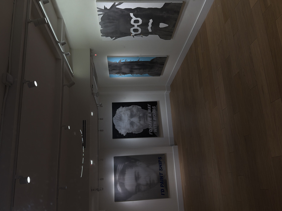 The image depicts the interior of an art gallery in New York City, United States of America. The room features white walls, a medium-brown hardwood floor laid in planks, and a white ceiling equipped with multiple white track lighting fixtures, several of which are illuminated. Four large, vertically oriented artworks are displayed on two adjacent walls. On the left wall, two grayscale portrait-style canvases are visible. The leftmost artwork features a woman resembling Frida Kahlo, with blue text "I'D PAINT SHIPS" positioned below her image. To its right, the second artwork displays an older man resembling Ian McKellen, with white text "I'D HAVE A WAY WITH WORDS" below his image. On the adjacent right wall, two additional artworks are presented. The first is a grayscale depiction, possibly abstract or a stylized figure, set against a vibrant blue background. The second artwork, further to the right, is a stylized grayscale portrait resembling Jean-Michel Basquiat, characterized by spiky hair, distinct round glasses, and a goatee, rendered against a white background. No individuals are present in the scene, and no actions or interactions are depicted. The environment is static and designed for art exhibition.