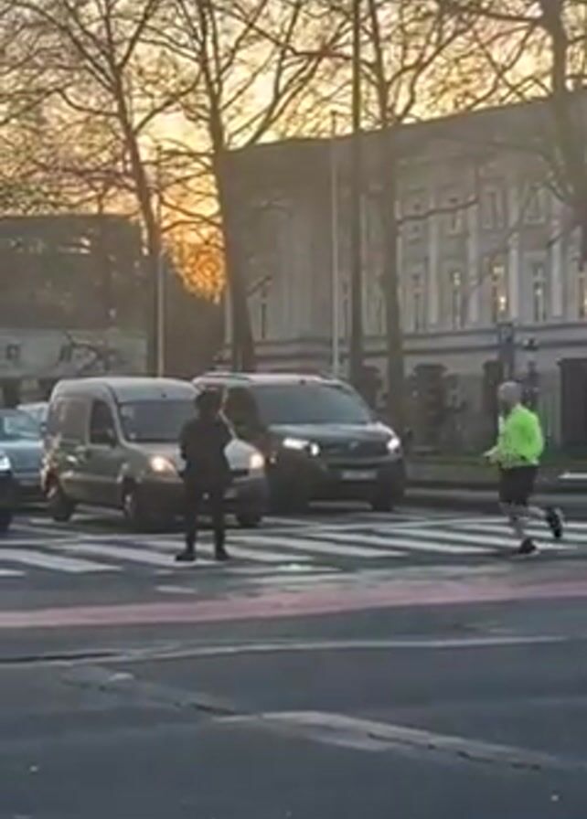 street scene during the golden hour, likely at sunset. In the foreground, a pedestrian crossing marked by white and red lines is visible. A person dressed in dark clothing is standing in the middle of the crosswalk, holding something red in their hands and seemingly gesturing towards the traffic. Several cars, including two vans of different colors, are stopped at the crosswalk. Another person in bright green jogging gear crosses the street behind them. In the background, there are leafless trees, a large building with classical architectural features, and some street lights. The sky shows a gradient of warm colors, suggesting the time of day. The overall scene appears to be an urban setting with pedestrian activity amidst vehicular traffic.