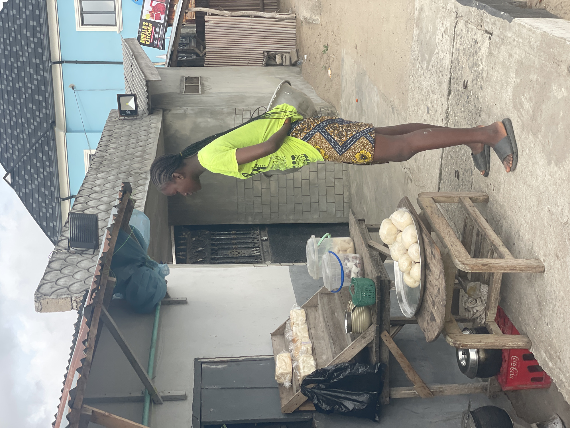 A young woman stands behind a makeshift wooden food stall in Badagry, Nigeria. She wears a bright yellow t-shirt and a patterned brown and blue skirt, and black sandals. The stall displays packages of bread, containers, and a silver tray of round doughy items. The stall sits on a concrete street, with buildings and corrugated metal fences in the background. A Coca-Cola crate is under the stall. The buildings have a light blue facade and gray trim.