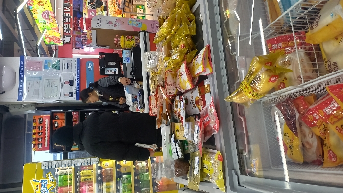 Two people are browsing the frozen food section of a grocery store. Shelves are stocked with various wrapped snacks, including some with yellow packaging. One person is wearing a dark jacket and a hat, while the other is wearing a gray jacket. There is signage and product displays behind the refrigerated section.