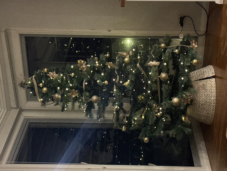 A decorated Christmas tree stands in the corner of a room in Bulli, Australia. The artificial evergreen tree is illuminated by numerous warm white string lights and adorned with gold spherical ornaments, gold floral-shaped ornaments, and a gold ribbon garland. A gold star serves as the tree topper. The base of the tree is enclosed by a light-colored, woven basket-style tree skirt. The tree is positioned directly in front of two large windows, through which a dark exterior is visible, dotted with scattered bright lights. The room features light-colored walls and a polished wooden floor. A black electrical cable from the tree is connected to a double wall power outlet on the right wall, near the floor. A partial view of a light-colored vertical structure is visible on the far right. No individuals are present, and no specific actions are depicted.