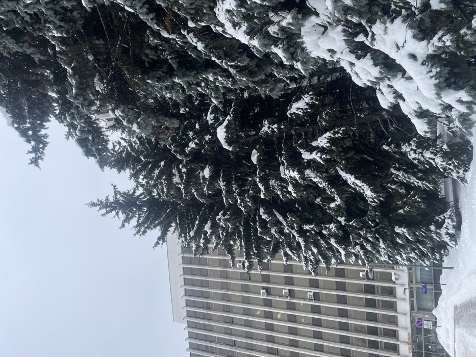 The image depicts a winter scene at the STANKOLIT business complex located at Ulitsa Obraztsova, 14, Moscow, Russia. A multi-story, light grey building with a facade characterized by vertical panels and numerous windows occupies the left side of the frame. Multiple white external air conditioning units are visible on the building's exterior. At the base of the building, a sign with Cyrillic text "СТАНКОЛИT" is discernible above the entrance, alongside a blue street sign and a circular blue traffic sign. The foreground and right side of the image are dominated by a dense row of evergreen trees, heavily laden with fresh snow. The ground is covered in deep, undisturbed snow, with a cleared, snow-dusted sidewalk visible in the lower left, leading past a snowdrift. The sky is overcast and uniformly light grey. No individuals or vehicles are present in the scene.