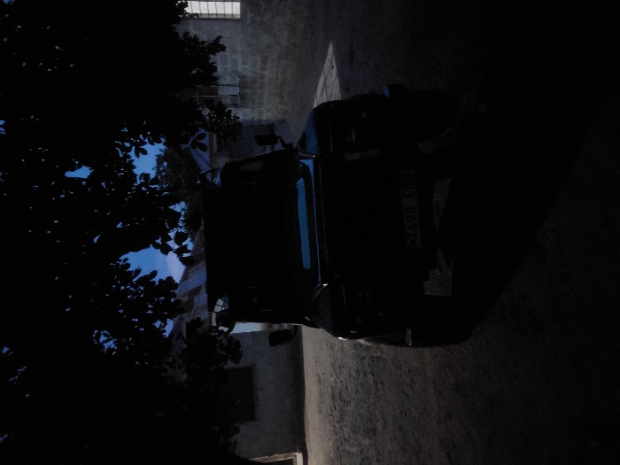 The image displays an outdoor scene in Mwandege, Tanzania, under low light conditions consistent with dusk or dawn. A dark-colored utility vehicle, likely an SUV, is centrally parked on an unpaved, dark ground surface, facing the viewer. The vehicle's front license plate is visible, displaying "T498 EBH". In the background, to the left, a light-colored building with a dark opening is partially visible. To the right, another building constructed of block or stone features a vertically barred window. Overhead, dark tree foliage frames the upper portion of the scene, silhouetted against a pale blue sky. No individuals, discernible actions, or interactions are present.