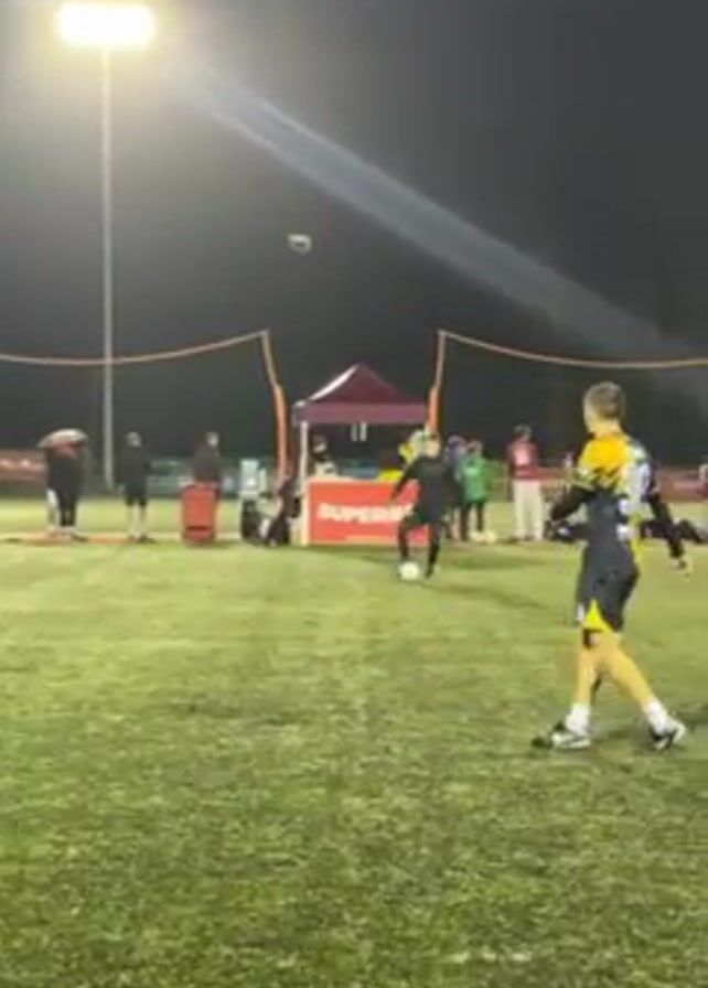 A soccer field at night lit by bright overhead lights. Players in sports gear stand around on the field; most are facing away from the camera. One player wearing a black and yellow sports jersey with the number 30 is facing the camera as he kicks a white soccer ball. In the background is a red tent with the word “SUPERBET” written on it. A net is in the background, and a few people are watching from the sidelines under umbrellas.