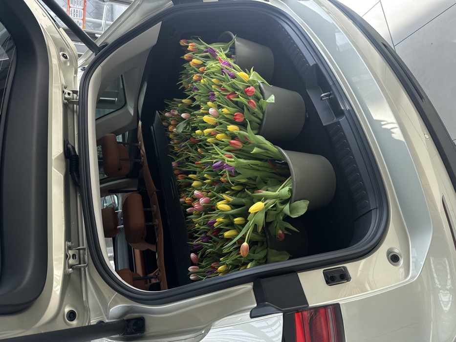 A light-colored, possibly champagne or silver, SUV is depicted indoors, consistent with a car dealership showroom in Sofia, Bulgaria. The vehicle's rear hatch is open, showcasing its cargo area filled with approximately five dark green or gray buckets. Each bucket contains a dense collection of fresh, multicolored tulips, exhibiting yellow, pink, red, and purple blooms with prominent green stems and leaves. The tulips occupy the majority of the trunk space. The vehicle's interior, visible through the rear window, features brown leather seats. The trunk floor is dark, potentially covered by a protective mat. Reflections on the car's paintwork and the tiled floor indicate a brightly illuminated indoor environment. A partial sign with the word "AUTO" is discernible in the background, reinforcing the setting as an automotive sales establishment. No individuals are visible. The scene illustrates the transport or display of a large quantity of flowers within a new or showroom vehicle.