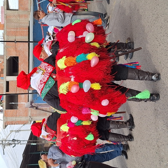 The image presents an outdoor scene on a paved surface in José Luis Bustamante y Rivero, Peru. Three individuals are central to the frame, viewed from the back or side, participating in what appears to be a procession. Each wears a distinctive costume consisting of a red head covering, a dark long-sleeved garment, and an embroidered white and red shawl draped over the shoulders. A voluminous, skirt-like garment made of numerous red textile strands, interspersed with vertical sections of multi-colored tassels (yellow, green, blue, pink, orange), extends from their waist. Small, inflated pastel-colored balloons (pink, white, light green, yellow) are attached to this red garment. All three wear dark, knee-high boots with visible buckles or straps; one boot features a light green tassel, and another has a light-colored metallic heel accent. The figure on the far right holds a dark, slender rod. To the left, a male bystander in a yellow cap, light blue shirt, and jeans holds a cluster of balloons. To the right, a young male in a gray hooded sweatshirt and glasses is observing the scene. The background includes partially constructed brick buildings with visible rebar, utility poles with dense overhead wiring, and a distant light-colored mountain under an overcast sky. The ground is a light gray paved street or plaza.