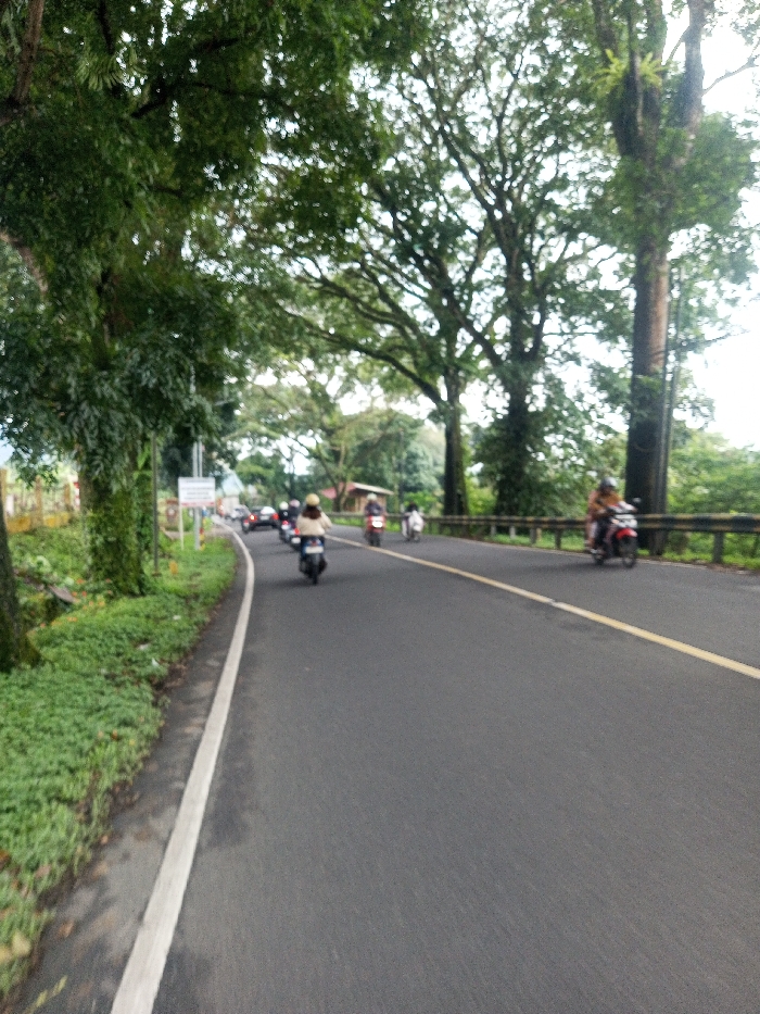 The scene depicts a two-lane asphalt road curving gently through a verdant environment, likely within Sandamal Eliya, Sri Lanka. The road surface is dark grey, featuring a solid white edge line on the left and a double yellow centerline separating traffic directions. Dense, lush green foliage and mature trees with extensive canopies line both sides, creating a somewhat shaded, tunnel-like effect. The ground immediately adjacent to the road on the left is covered with short green plants. Vehicular traffic consists primarily of motorcycles and scooters. In the foreground on the left lane, a dark-colored scooter is driven by an individual wearing a light-colored helmet and top, traveling away from the viewer. On the opposite lane, a red motorcycle is visible, operated by a person wearing a dark helmet and top, also traveling away from the viewer. Several additional motorcycles and scooters, varying in color, are observed further down the road on both sides, with riders typically wearing helmets. A blurred metal guardrail runs along the right side of the road in the mid-ground. Two indistinct white signs on poles are visible on the left side. The sky is overcast.