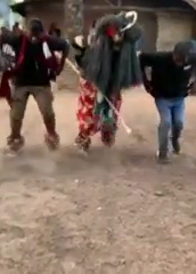 group of men participating in a traditional dance, likely in a village setting. There are seven main dancers visible, each dressed in a variety of outfits ranging from traditional patterned clothing to modern attire like jeans and t-shirts. Most of the dancers have objects tied to their legs that create a rattling sound as they move. One of the dancers is wearing a large, dark, fur-like costume with a red and white mask. The dancers are performing a synchronized jumping motion, kicking up dust as they move. They are arranged in a line, moving roughly in the same direction. A crowd of people is gathered in the background watching the performance. The environment appears to be a village common area, with simple buildings, trees, and parked motorcycles visible in the background. The lighting suggests it is either early morning or late afternoon.