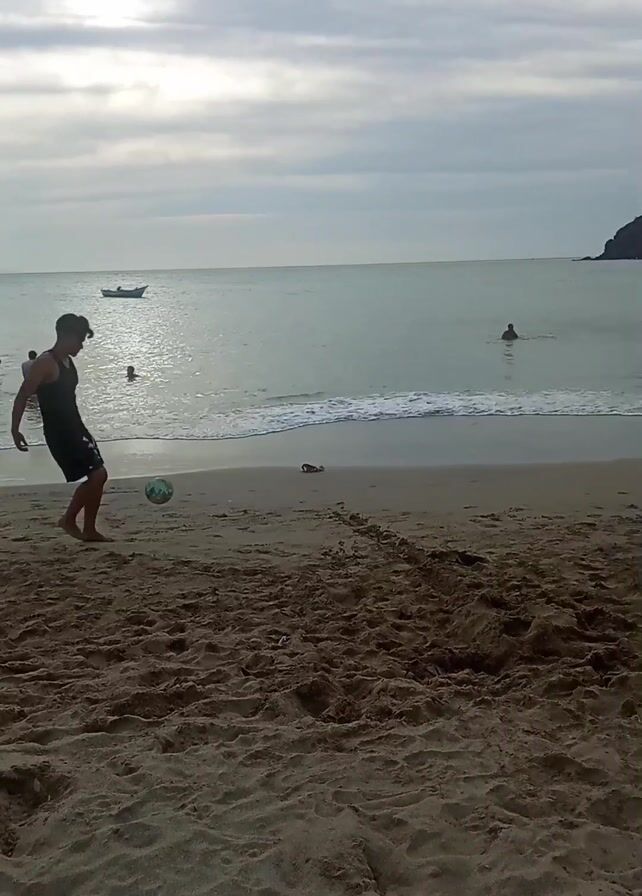 young man dribbling a soccer ball on a sandy beach. He is wearing shorts and a tank top. The beach is wide and there are other people in the water in the background. There's also a small boat in the water. A woman walks across the beach carrying a basket and there's a boogie board in the sand. The sky is cloudy.