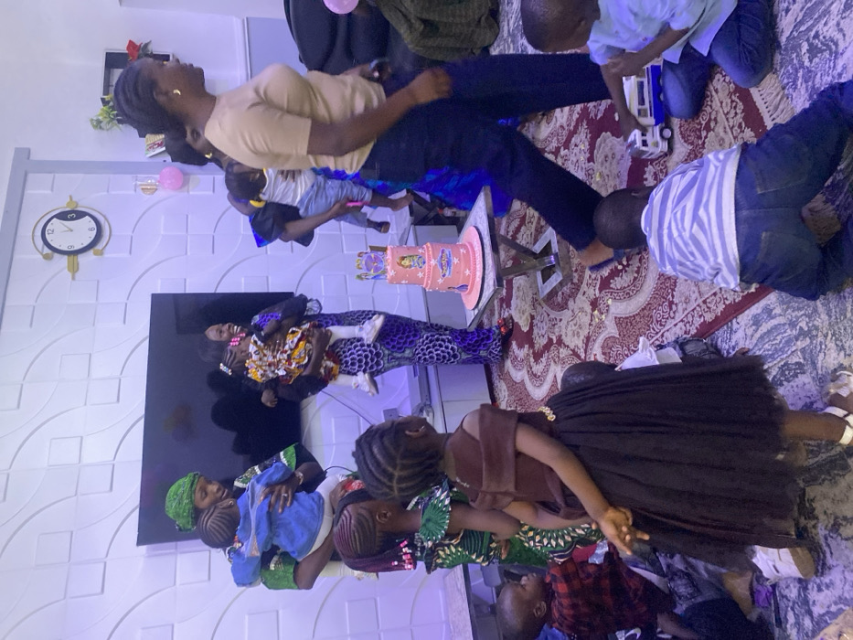 The image depicts an indoor gathering within a residence or event space in Kwang, Nigeria