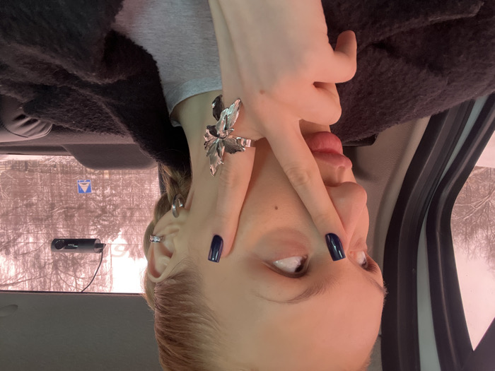 A female individual is depicted from the chest up, seated in the rear passenger compartment of a vehicle. Her light-colored hair is pulled back, and her left facial profile is presented, with her gaze directed upwards and to her right. Her left index finger is positioned vertically, touching the bridge of her nose between her eyes. Her fingernails are uniformly painted a dark blue. She wears a prominent, silver-toned ring with a stylized leaf or botanical design on her left ring finger, a silver-toned hoop earring in her left earlobe, and a silver-toned ear cuff on the upper helix of her left ear. She is dressed in a grey garment under a dark, possibly black, textured outer layer. The vehicle's interior features dark upholstery on the back seat. A black, rectangular dashcam or electronic device is mounted on the upper section of the rear window, slightly to the right of the center. Through the vehicle's windows, a winter landscape is visible. Bare trees, sparsely covered with snow, are present, suggesting a cold environment. The ambient outdoor lighting casts a subtle reddish-pink tint across the scene. A standard blue rectangular road sign featuring a white pedestrian crossing icon is discernible through the rear window. This scene is located in the city of Chaikovsky, Russia, during winter conditions.